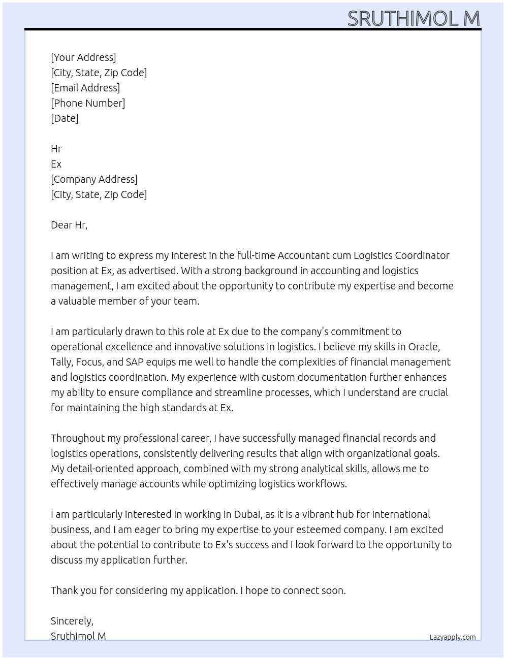 Accountant cum logistics coordinator Cover Letter At Ex
