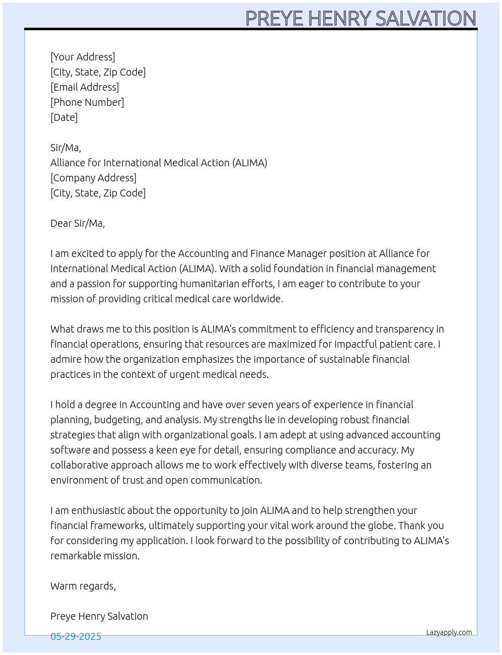 Accounting and Finance Manager Cover Letter At Alliance for International Medical Action (ALIMA)
