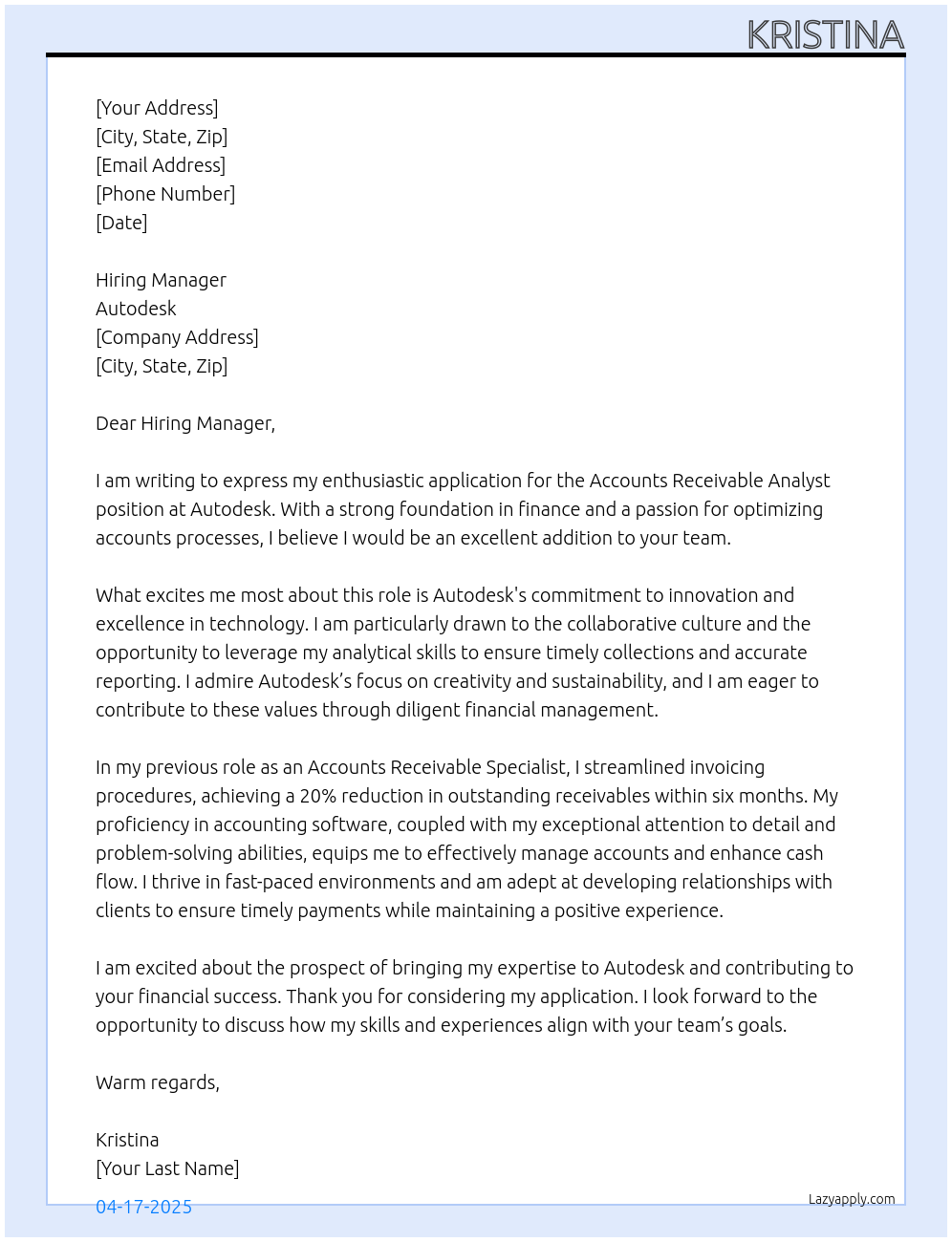 Check out these accounts receivable analyst cover letter sample and examples previously used by job seekers to land on job interviews as accounts receivable analyst. Use our AI cover letter generator to create a personalized cover letter as accounts receivable analyst.