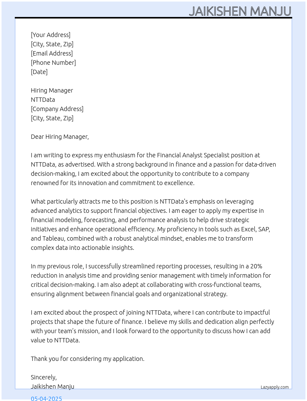 Financial Analyst Specialist Cover Letter At NTTData