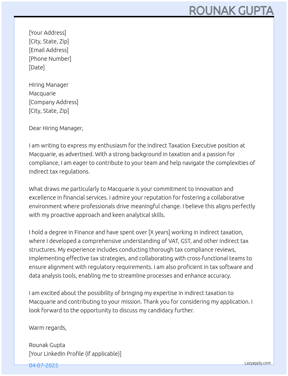 Check out these indirect taxation executive cover letter sample and examples previously used by job seekers to land on job interviews as indirect taxation executive. Use our AI cover letter generator to create a personalized cover letter as indirect taxation executive.