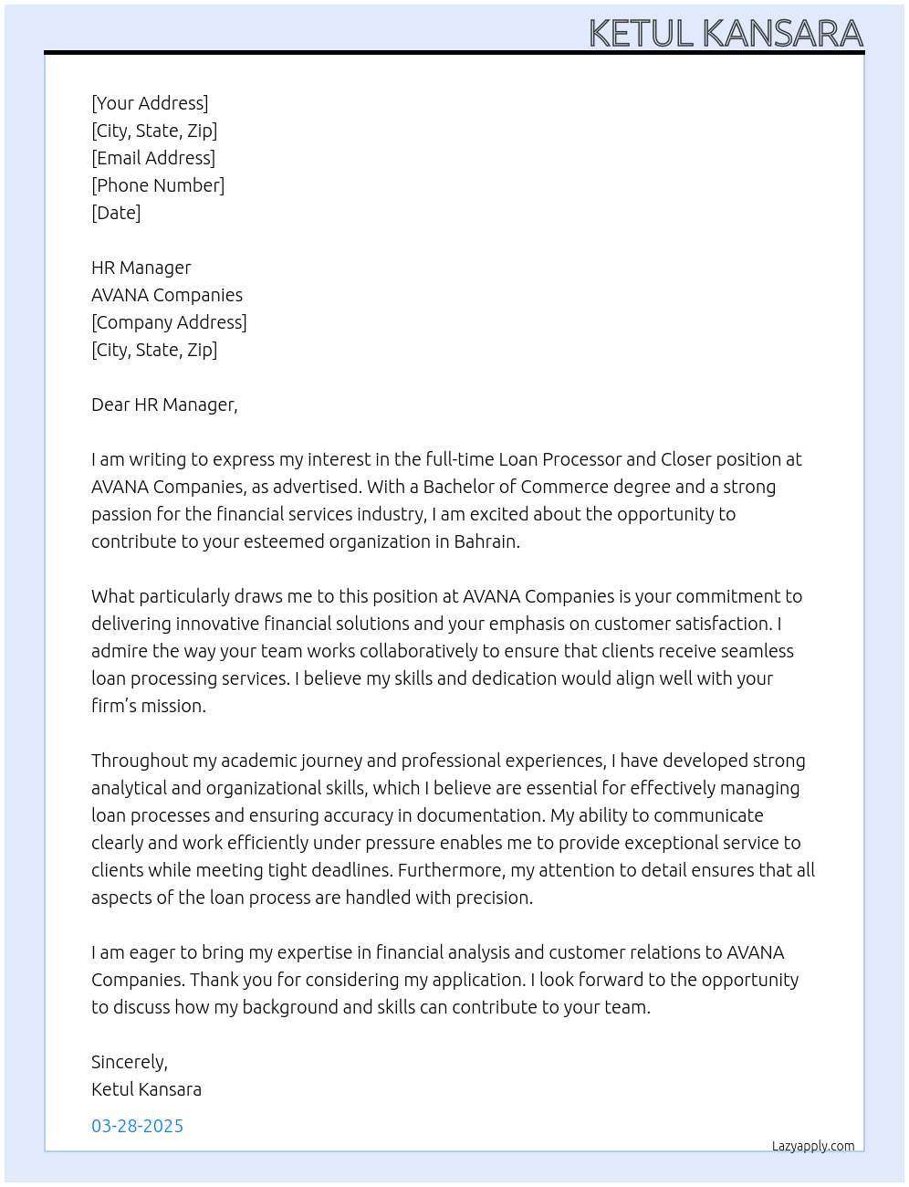 Loan processor and closer Cover Letter At AVANA COMPANIES