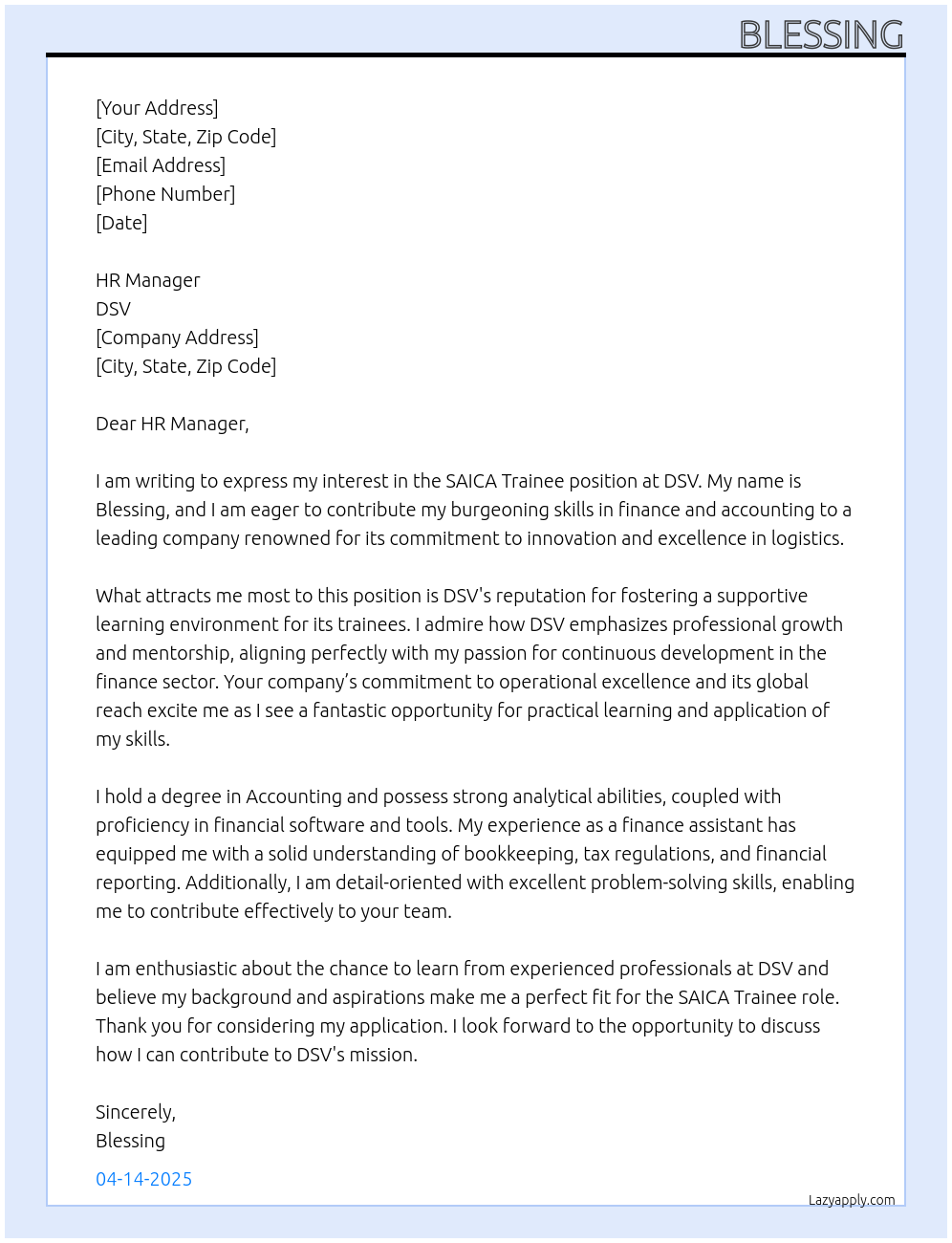 Check out these saica trainee cover letter sample and examples previously used by job seekers to land on job interviews as saica trainee. Use our AI cover letter generator to create a personalized cover letter as saica trainee.