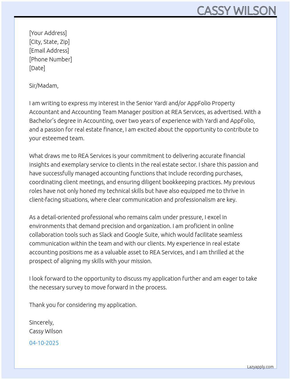 Senior Yardi and/or Appfolio Property Accountant and Accounting Team Manager Cover Letter At REA Services
