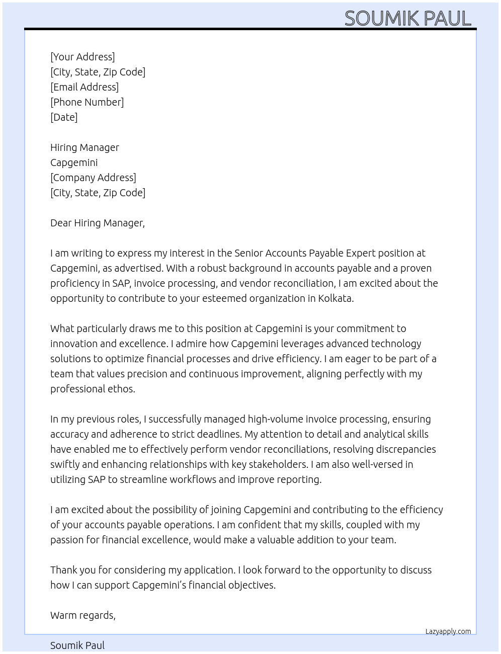 Check out these accounts payable expert cover letter sample and examples previously used by job seekers to land on job interviews as accounts payable expert. Use our AI cover letter generator to create a personalized cover letter as accounts payable expert.