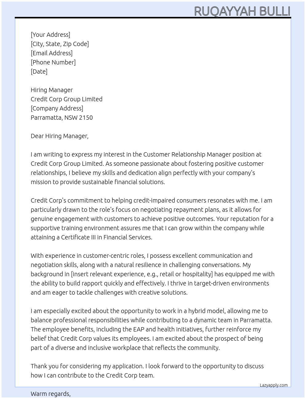 a short walk from the station and local shops and eateries No weekends or late nights! Monday – Friday 8:30AM – 5:00PM No collections experience required! Supportive training and career progression + gain a Cert III in Financial Services Credit Corp is Australia's largest provider of sustainable financial services to the credit impaired consumer segment. Our core business specialises in debt purchase and debt collection services and we’re committed to providing sustainable financial solutions delivered responsibly. We work with our customers to agree affordable repayments which improve their credit standing over time while ensuring they can remain active in the community. About your new role As a Customer Relationship Manager