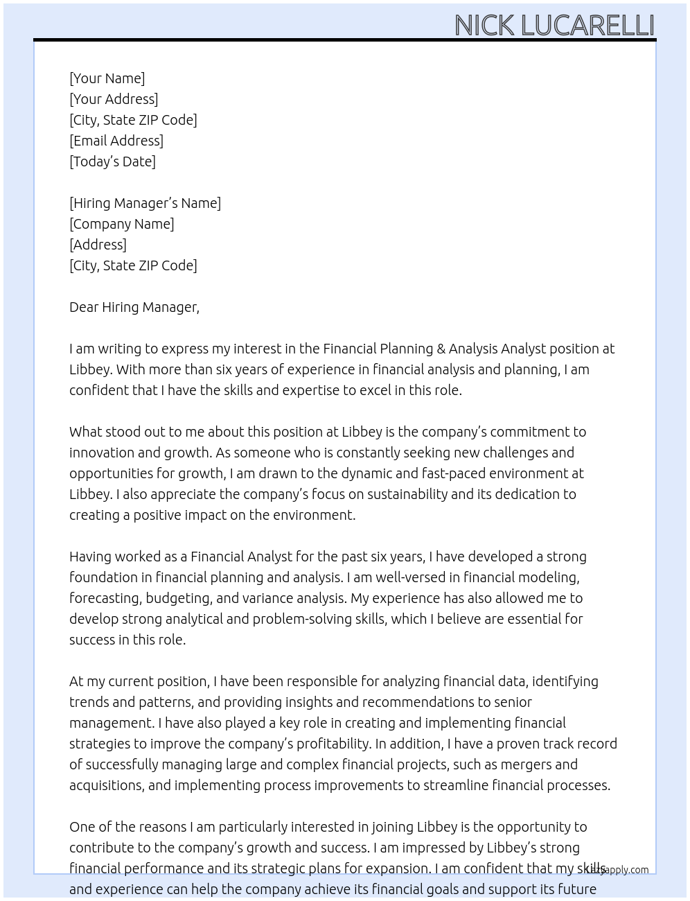 Financial Planning & Analysis Analyst Cover Letter At Libbey
