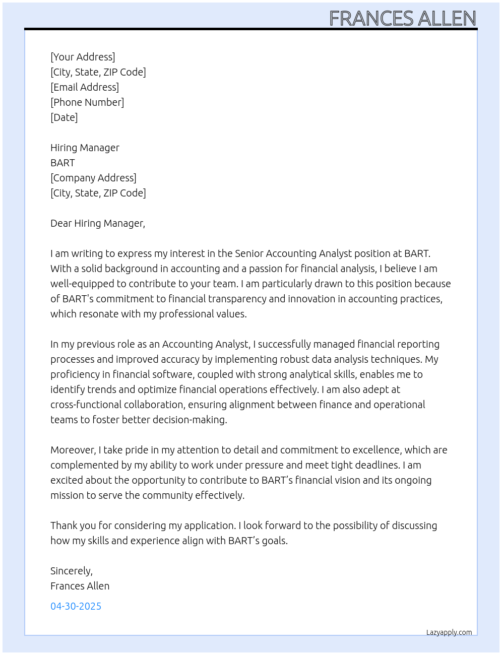 Check out these senior accounting analyst cover letter sample and examples previously used by job seekers to land on job interviews as senior accounting analyst. Use our AI cover letter generator to create a personalized cover letter as senior accounting analyst.