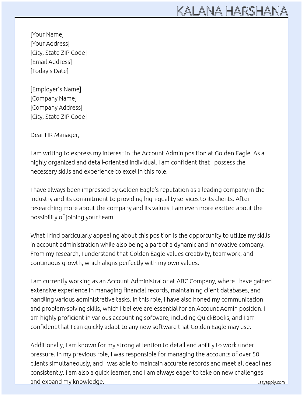 account admin Cover Letter At golden eagle