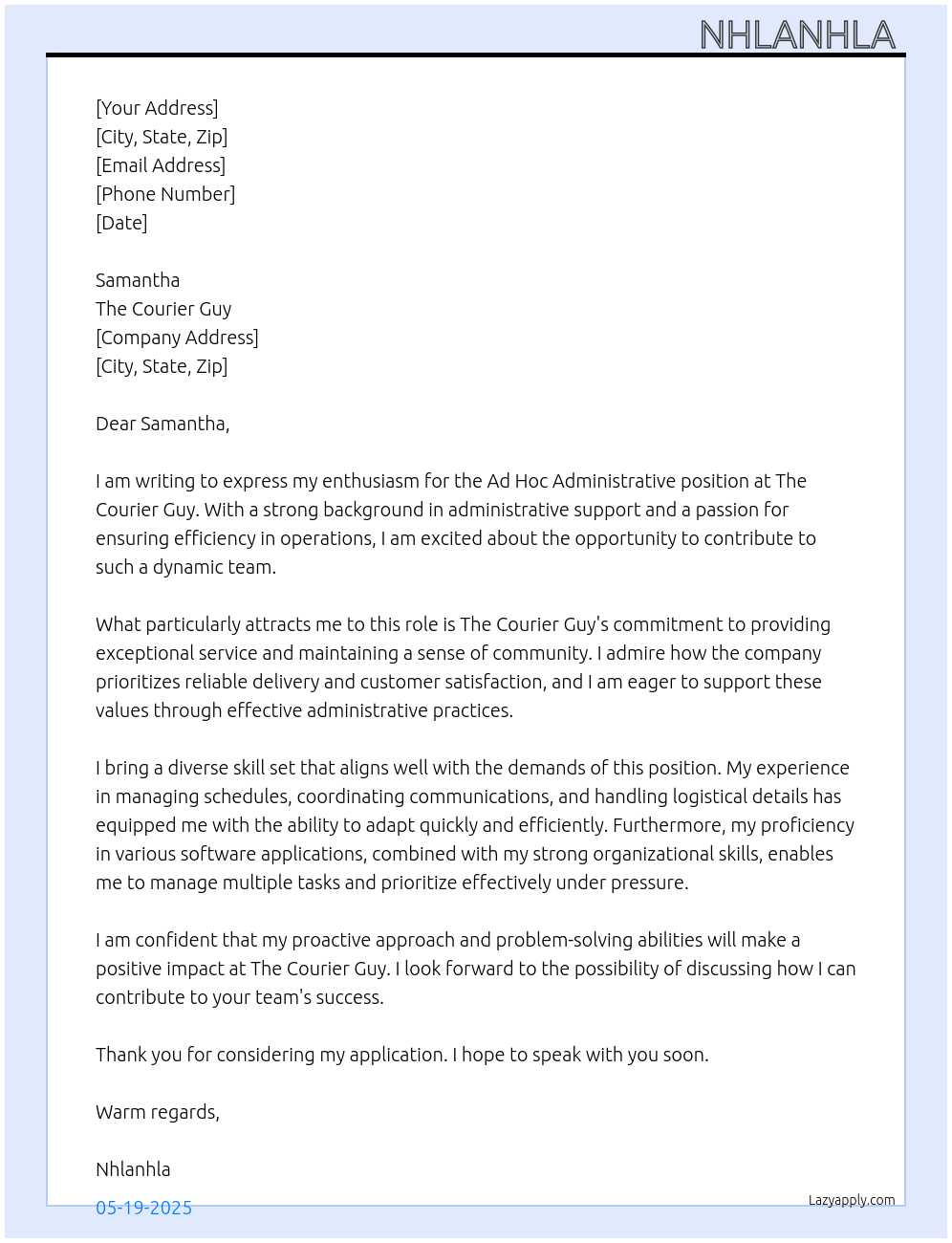 Check out these ad hoc administrative cover letter sample and examples previously used by job seekers to land on job interviews as ad hoc administrative. Use our AI cover letter generator to create a personalized cover letter as ad hoc administrative.