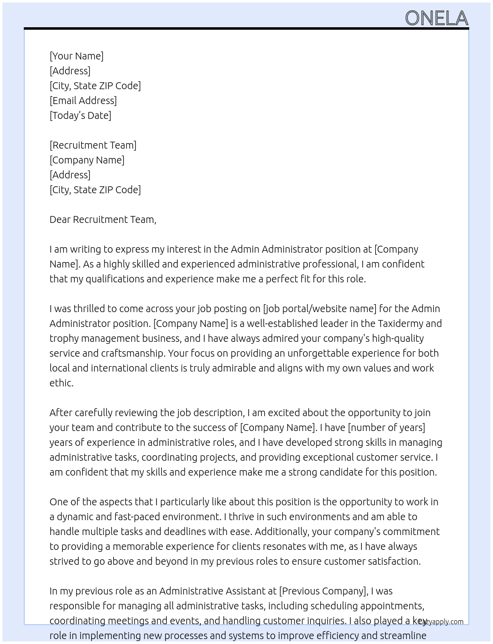 admin administrator Cover Letter At company that is a well-established leader in the Taxidermy and trophy management business. We offer high quality service and craftsmanship to both local and international clients and provide an experience that is worth remembering.