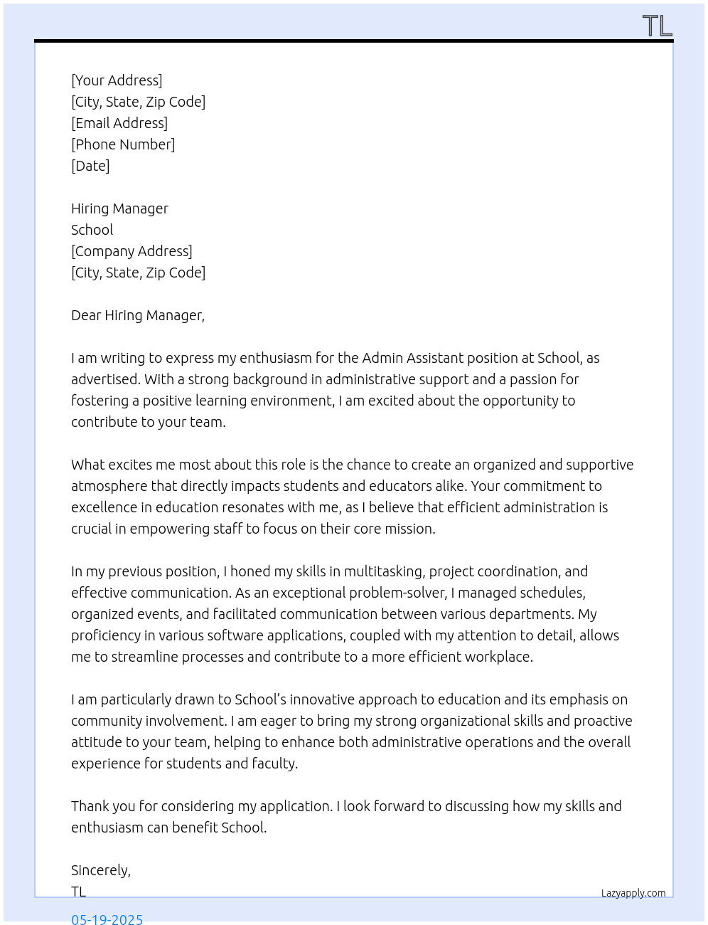 Check out these admin assitant cover letter sample and examples previously used by job seekers to land on job interviews as admin assitant. Use our AI cover letter generator to create a personalized cover letter as admin assitant.