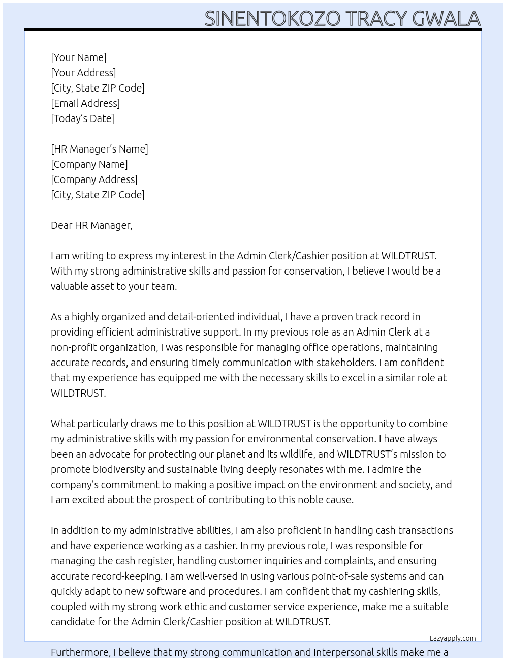 Admin Clerk / Cashier Cover Letter Examples And Template