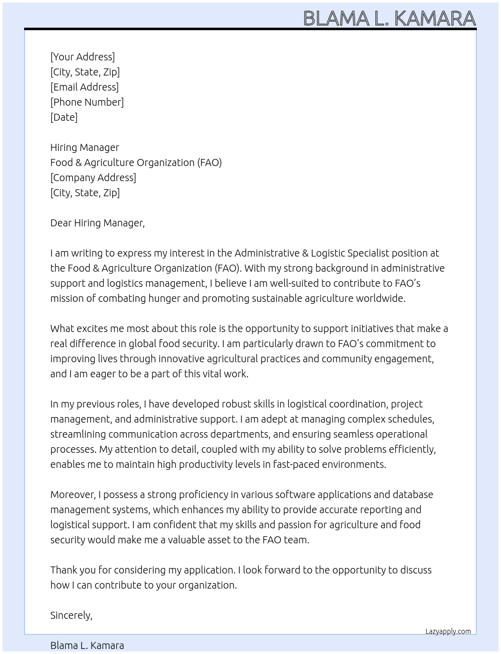 Administitive & Logistic Specialist Cover Letter At Food & Agriculture Organization FAO