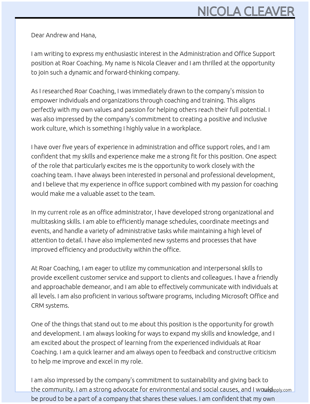 Administration and office support Cover Letter At Roar Coaching