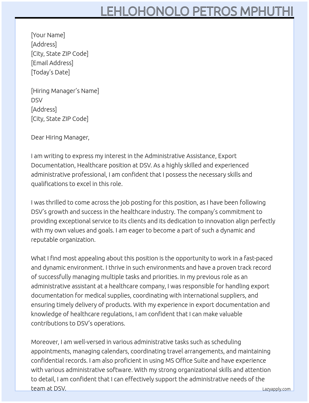 Administrative Assistance, Export Documentation, Healthcare Cover Letter At DSV