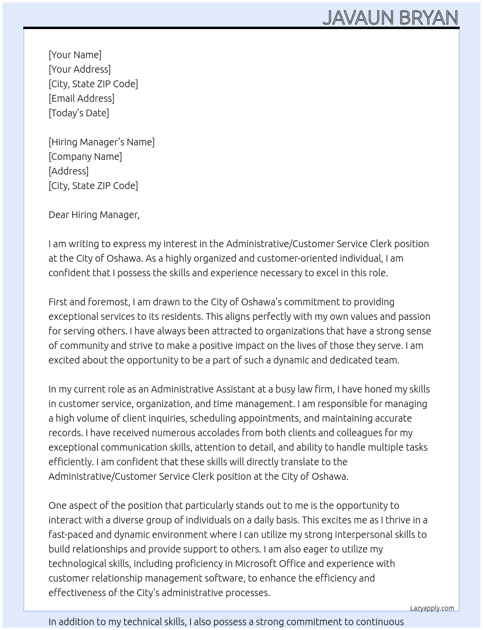 Administrative/Customer Service Clerk Cover Letter At City of Oshawa
