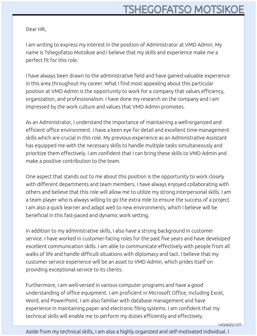 Adminstrator Cover Letter At Motsikoe