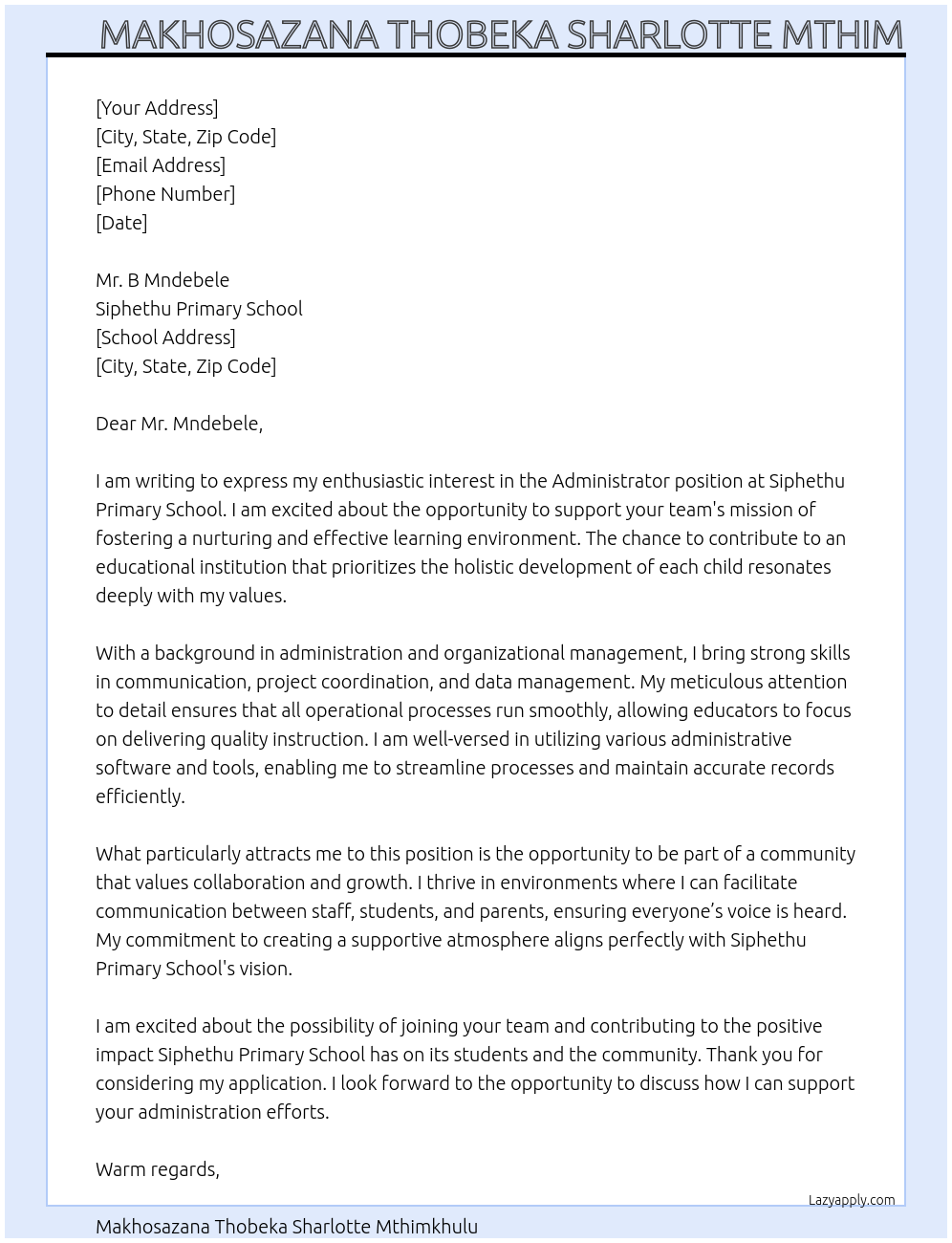 Check out these aministrator cover letter sample and examples previously used by job seekers to land on job interviews as aministrator. Use our AI cover letter generator to create a personalized cover letter as aministrator.