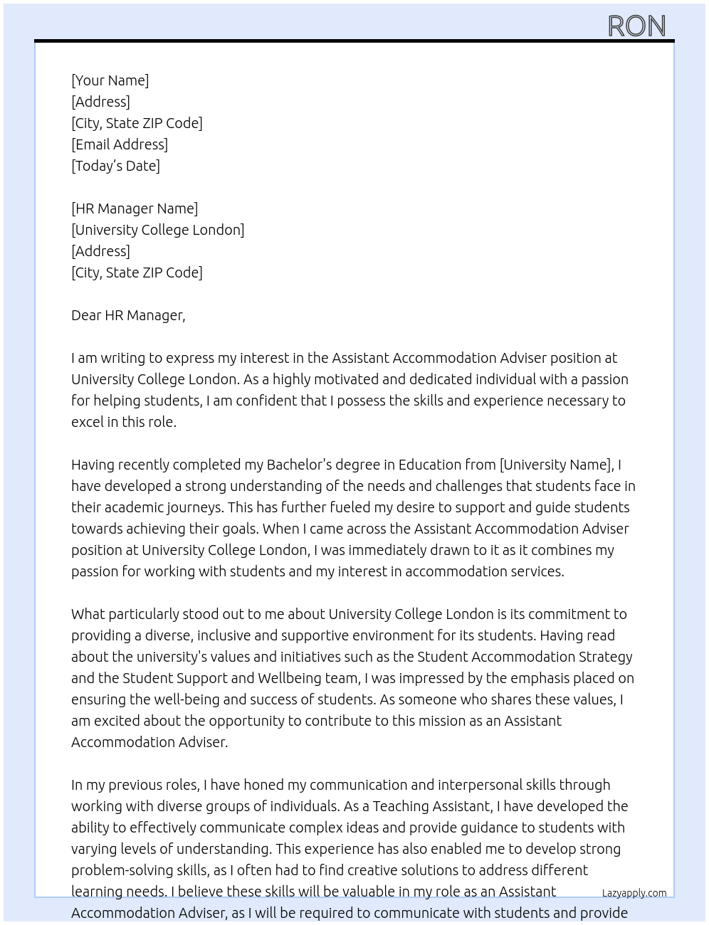 Assistant Accommodation Adviser Cover Letter Examples And Template