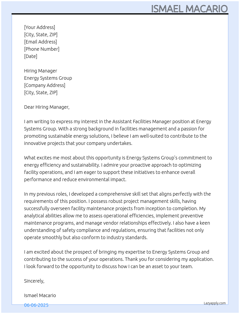 Assistant Facilities Manager Cover Letter At Energy Systems Group