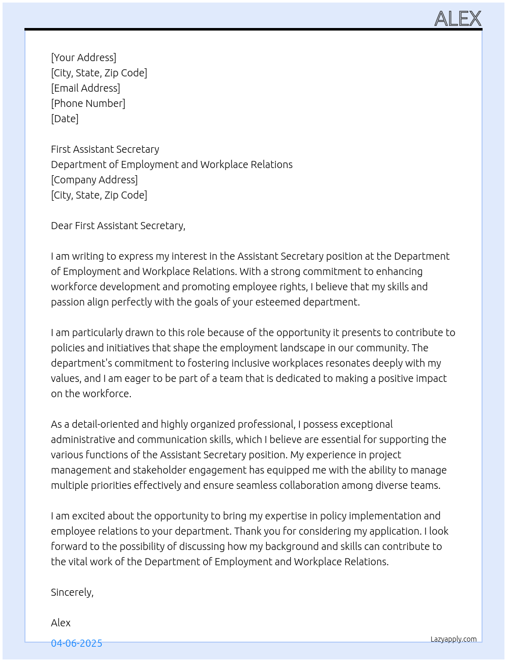 Assistant Secretary Cover Letter At Department of Employment and Workplace Relations