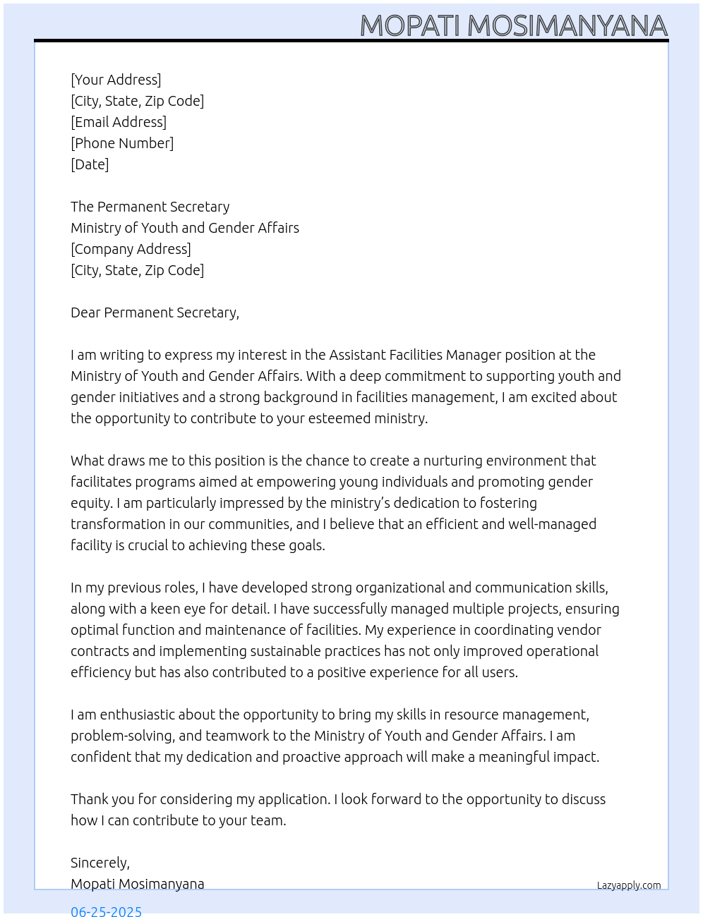 assitant Facilties Manage Cover Letter At ministry of youth and gender affairs
