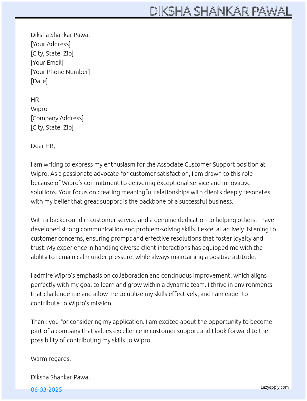 Check out these associate customer support cover letter sample and examples previously used by job seekers to land on job interviews as associate customer support. Use our AI cover letter generator to create a personalized cover letter as associate customer support.