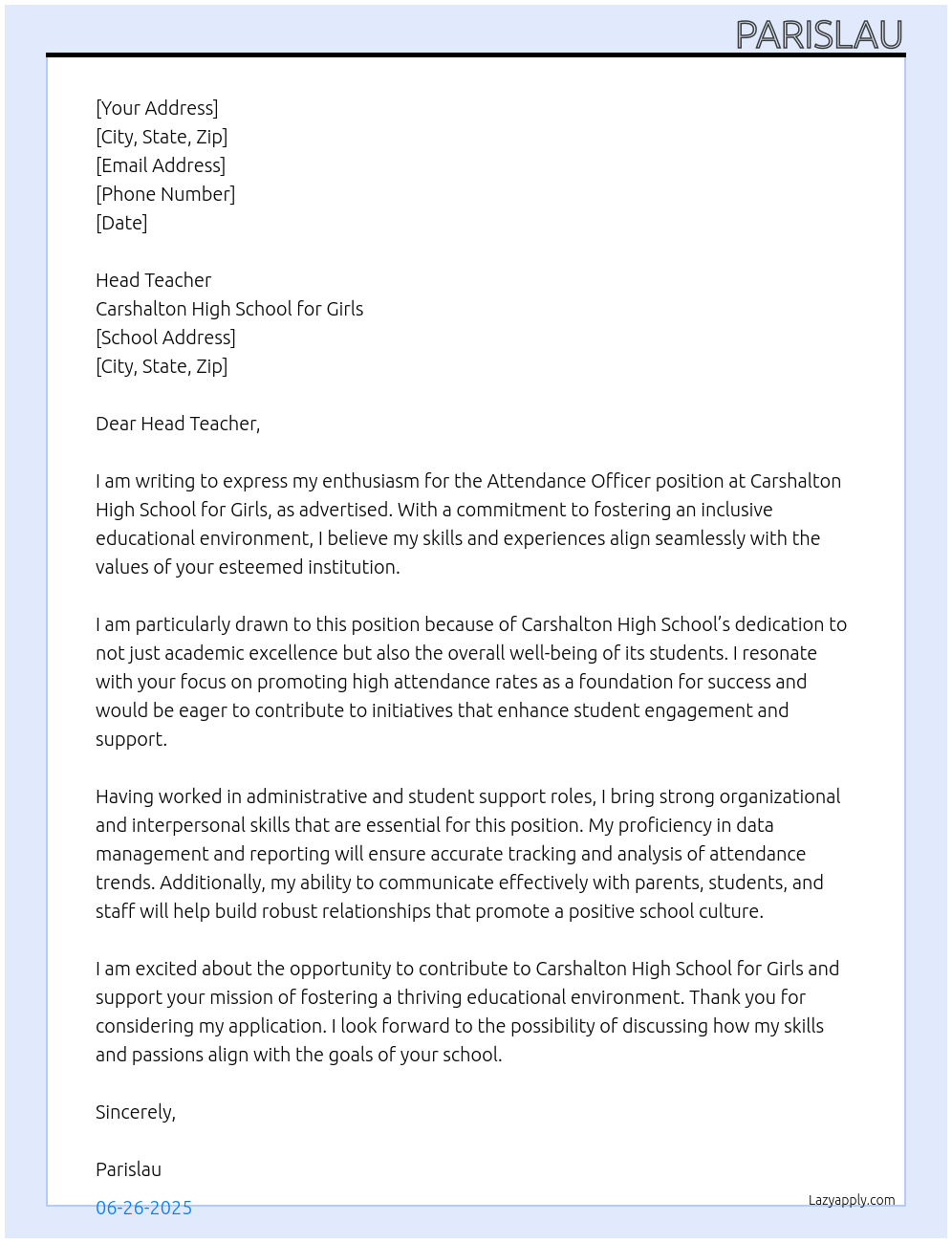 Check out these attendance officer cover letter sample and examples previously used by job seekers to land on job interviews as attendance officer. Use our AI cover letter generator to create a personalized cover letter as attendance officer.