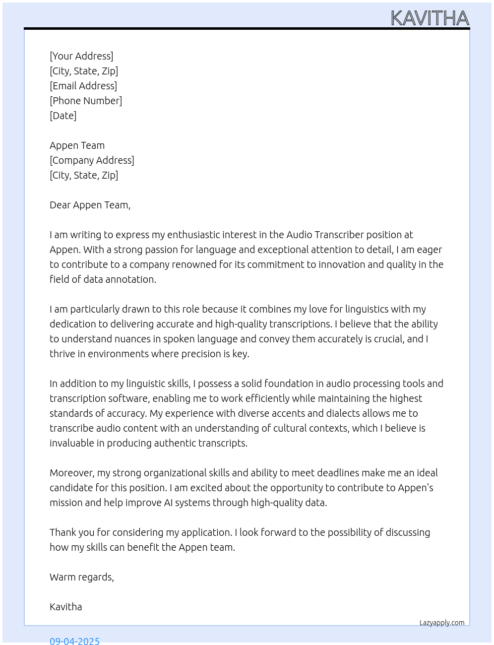 Check out these audio transcriber cover letter sample and examples previously used by job seekers to land on job interviews as audio transcriber. Use our AI cover letter generator to create a personalized cover letter as audio transcriber.