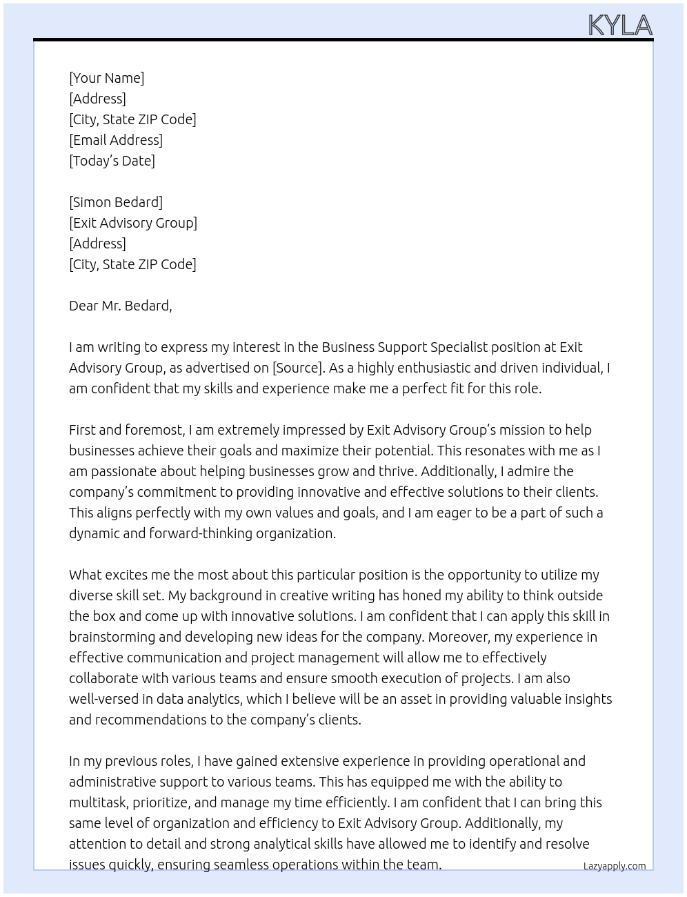 Business Support Specialist Cover Letter At Exit Advisory Group