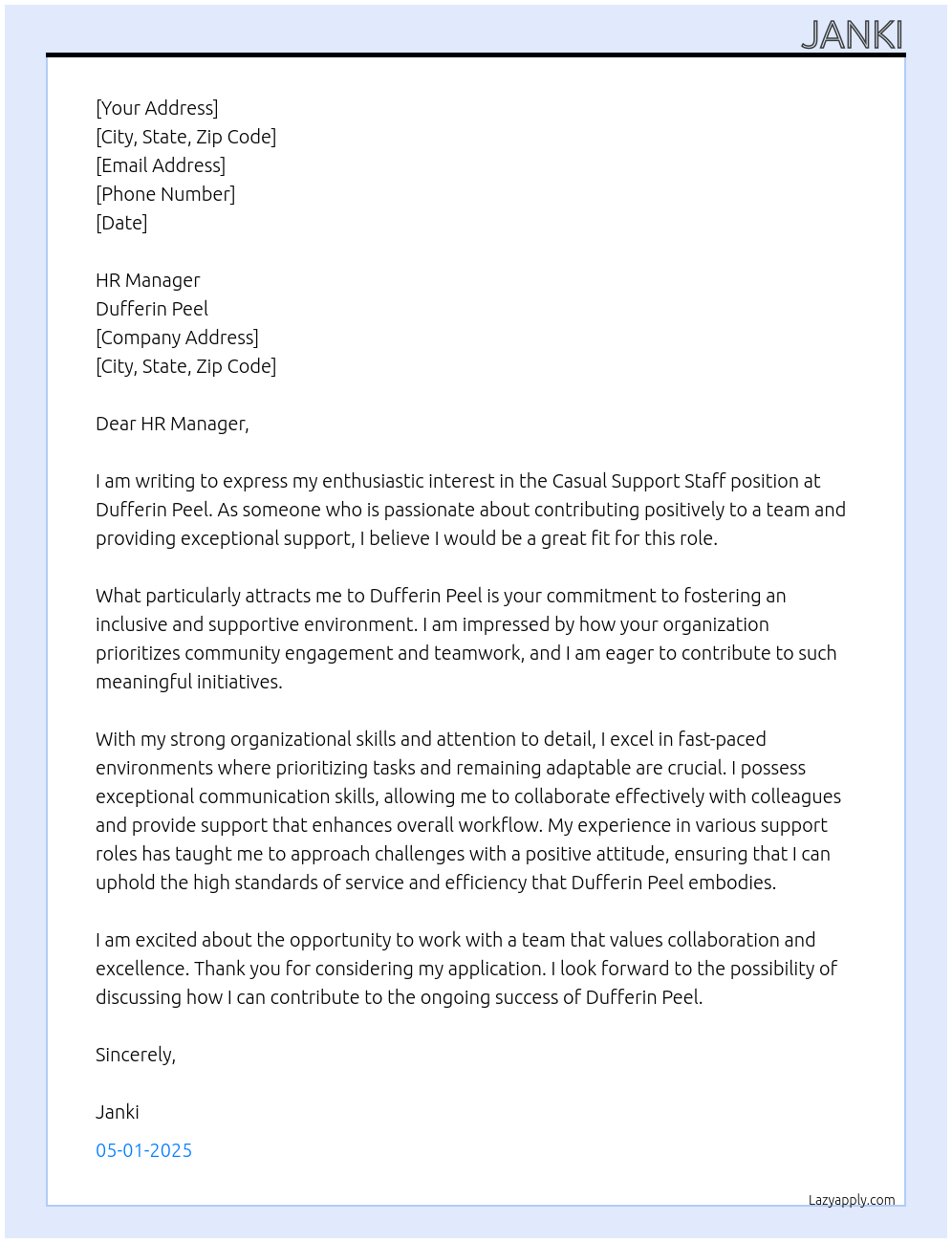 Check out these casual support staff cover letter sample and examples previously used by job seekers to land on job interviews as casual support staff. Use our AI cover letter generator to create a personalized cover letter as casual support staff.