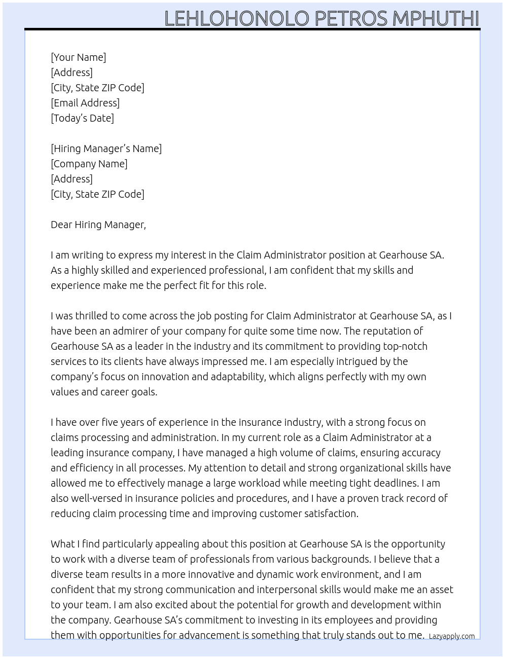 Check out these claim administrator cover letter sample and examples previously used by job seekers to land on job interviews as claim administrator. Use our AI cover letter generator to create a personalized cover letter as claim administrator.