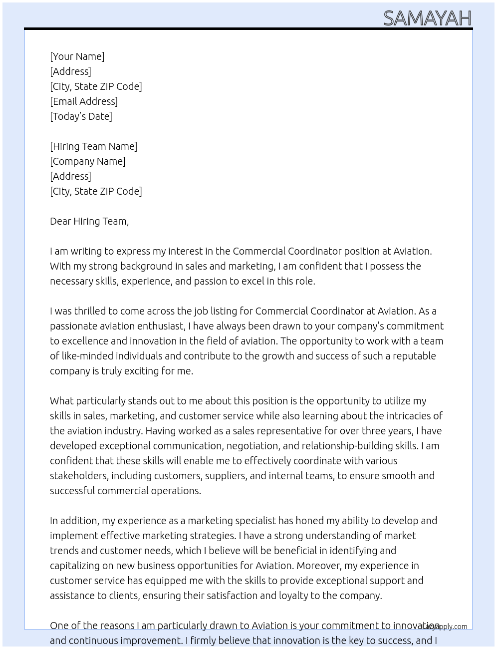 Commercial cordinator Cover Letter At Aviation
