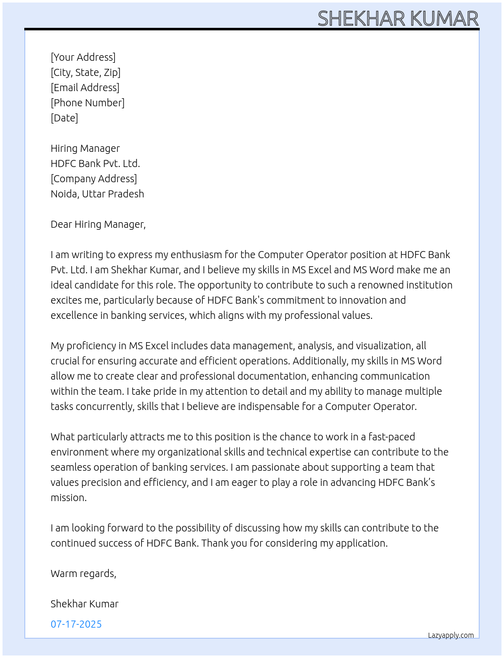 Computer Operater Cover Letter At HDFC Bank Pvt.Ltd