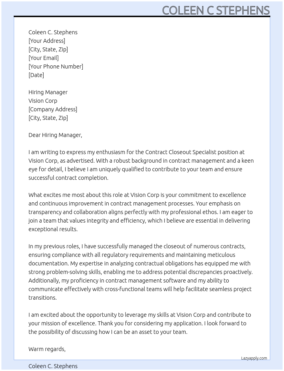 Contract Closeout Specialist Cover Letter At Vision Corp