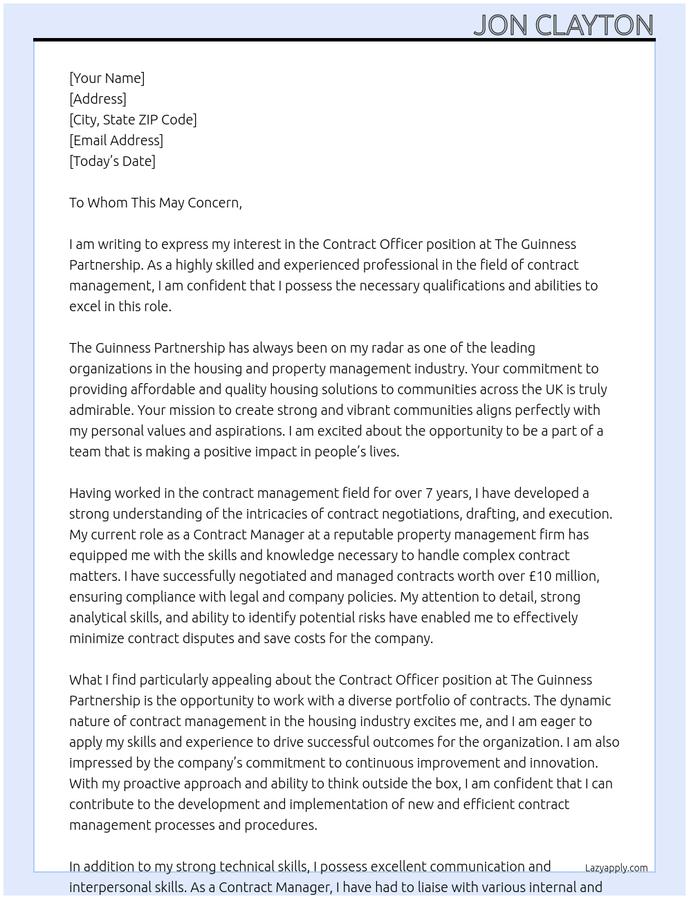 Check out these contract officer cover letter sample and examples previously used by job seekers to land on job interviews as contract officer. Use our AI cover letter generator to create a personalized cover letter as contract officer.