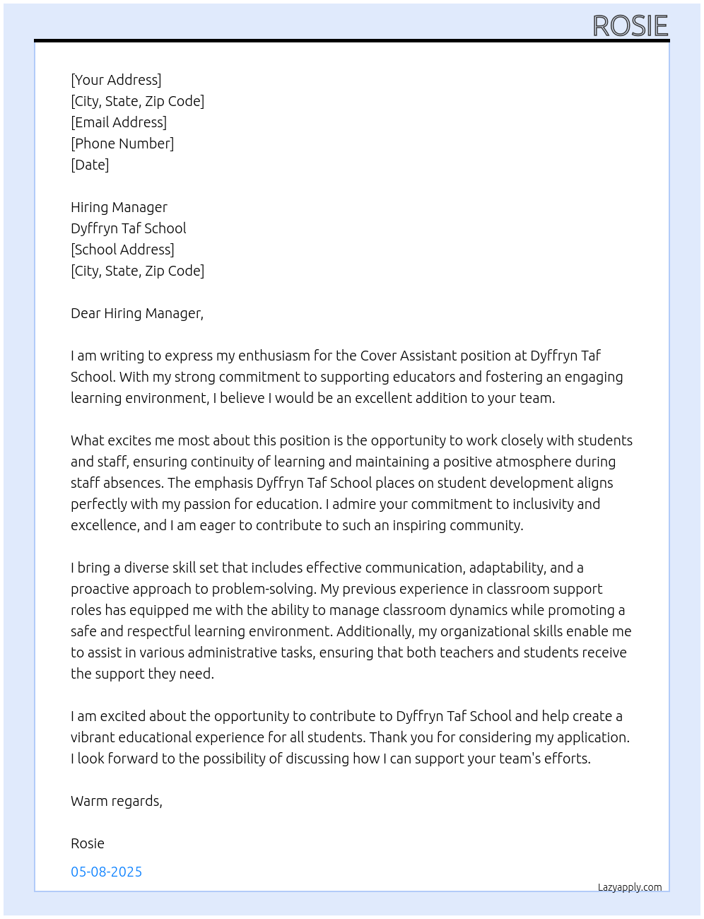 Check out these cover assistant cover letter sample and examples previously used by job seekers to land on job interviews as cover assistant. Use our AI cover letter generator to create a personalized cover letter as cover assistant.