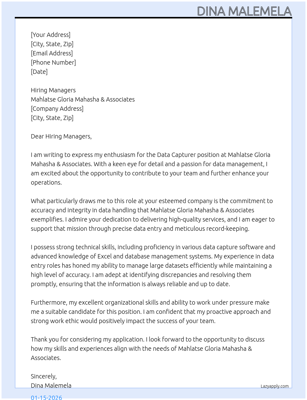 Cover letter for data capturer - LazyApply