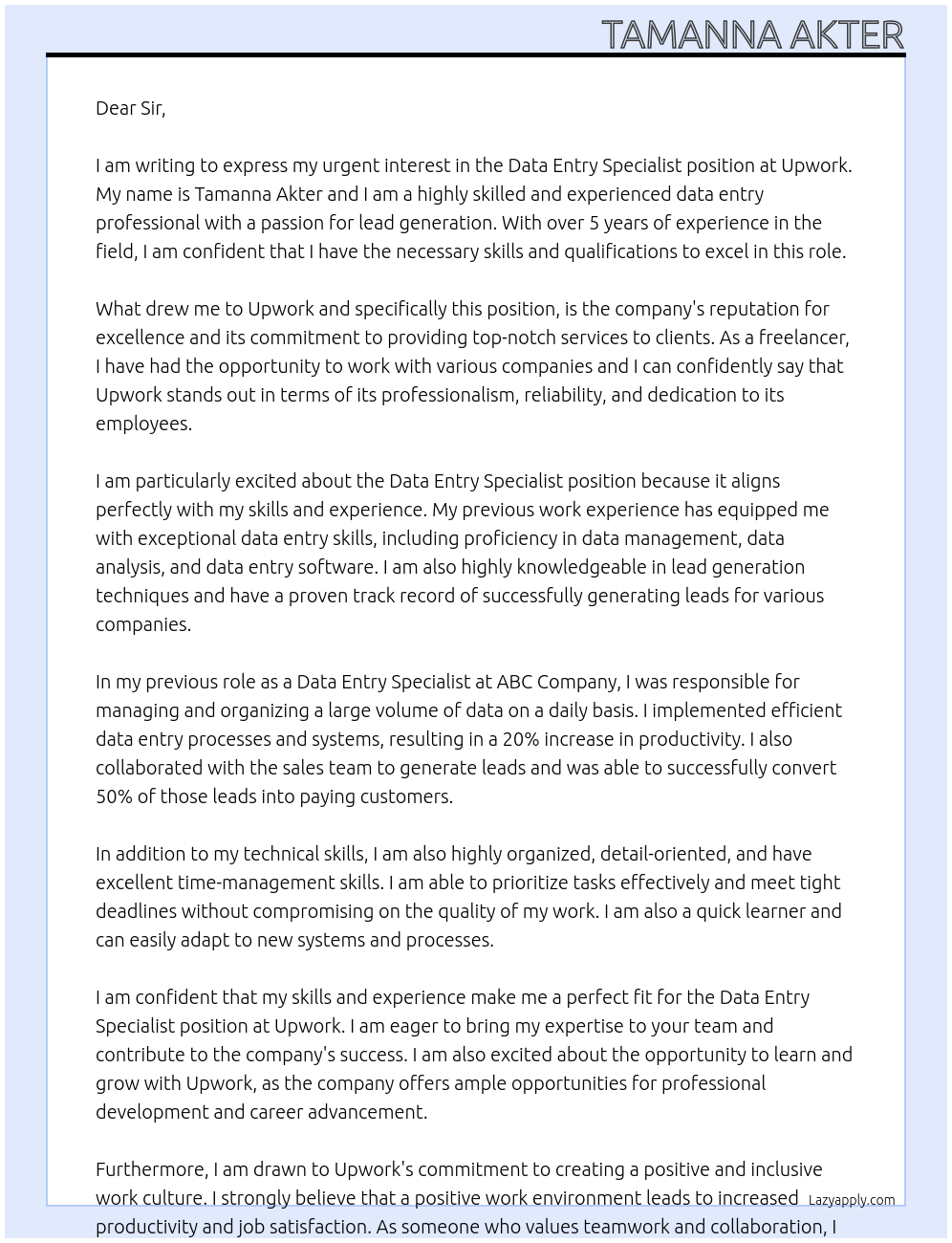 Cover letter for data entry, lead generation - LazyApply