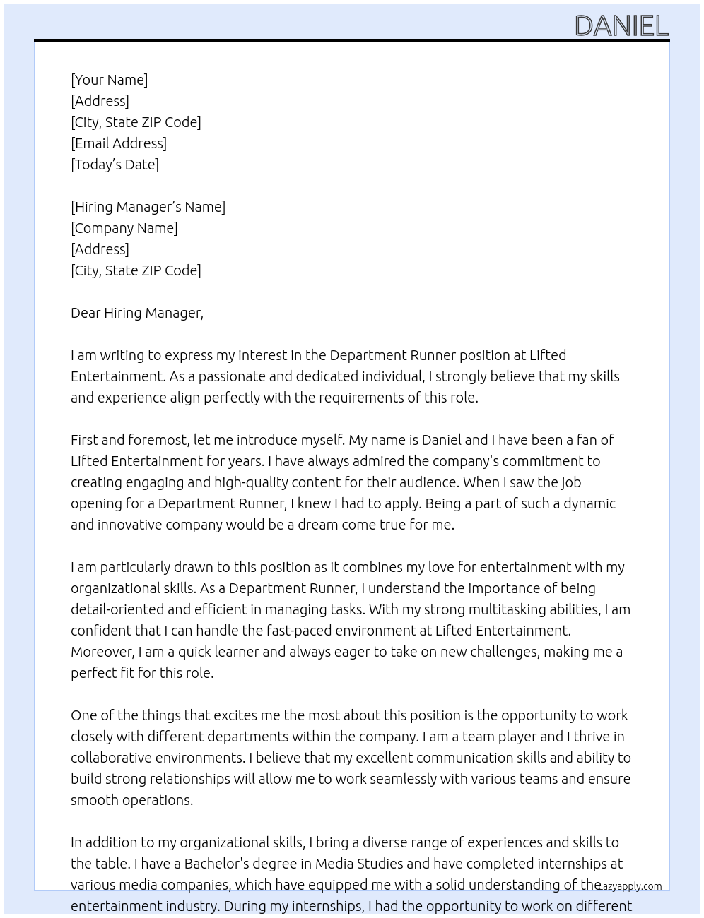 Check out these department runner cover letter sample and examples previously used by job seekers to land on job interviews as department runner. Use our AI cover letter generator to create a personalized cover letter as department runner.