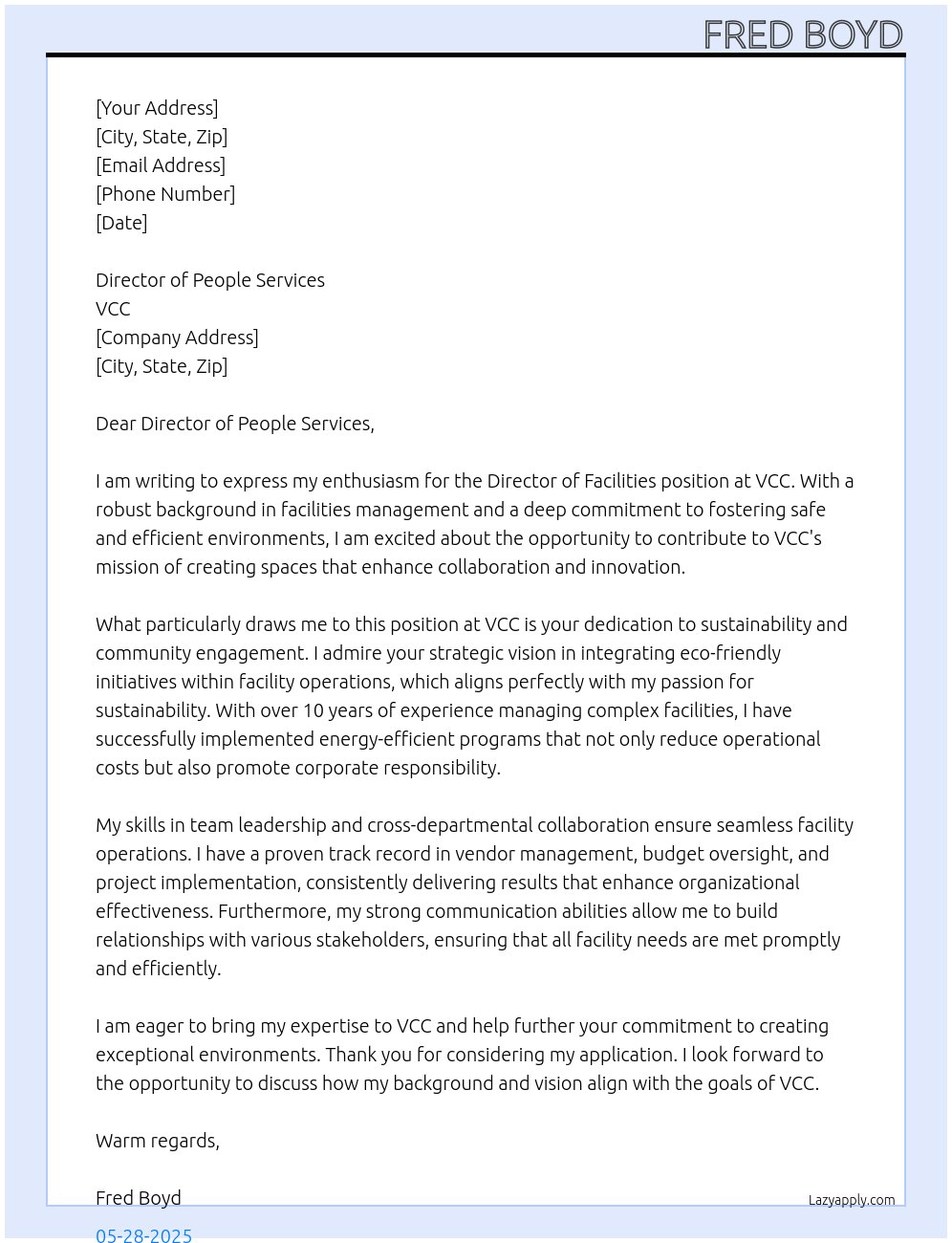 Check out these director of facilities cover letter sample and examples previously used by job seekers to land on job interviews as director of facilities. Use our AI cover letter generator to create a personalized cover letter as director of facilities.
