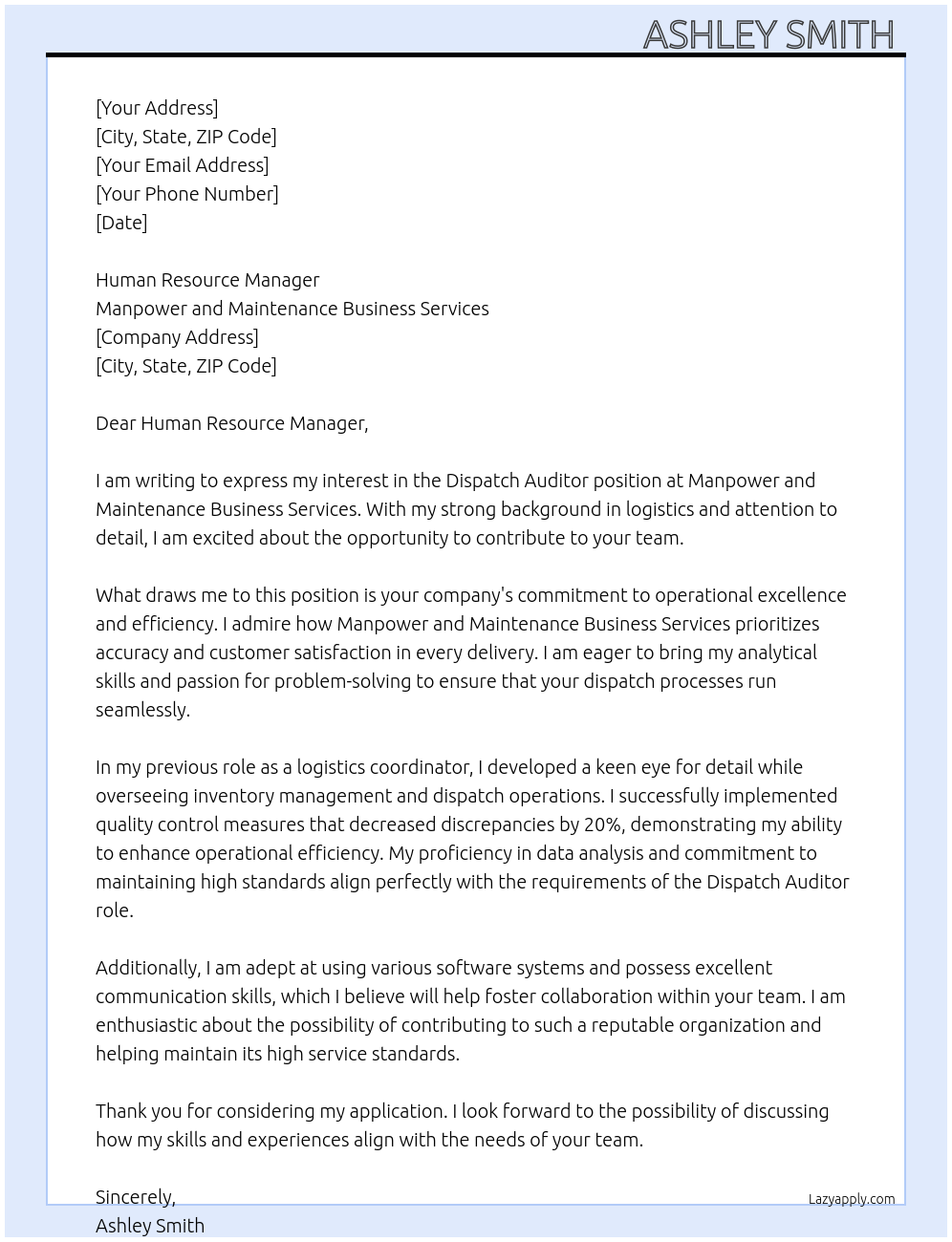 Dispatch auditor Cover Letter At Manpower and maintenance business services