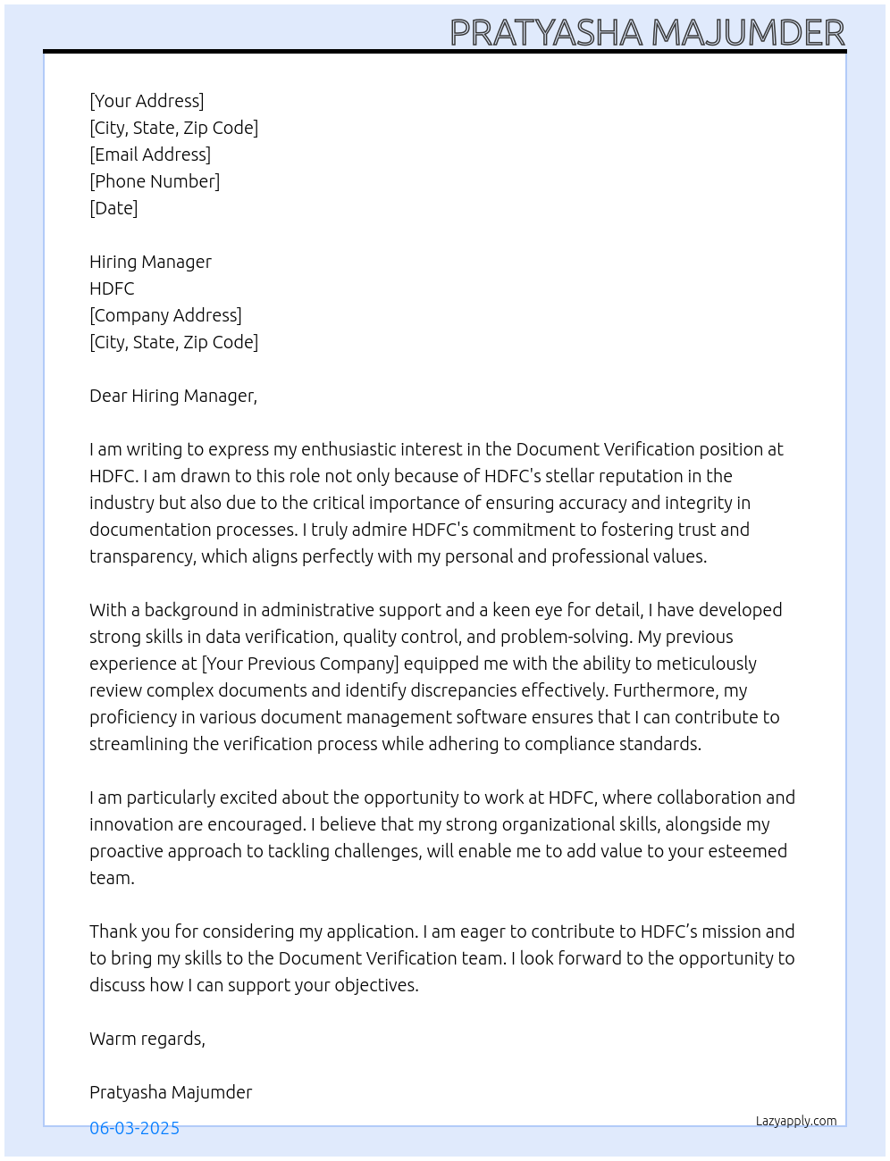 Check out these document verification cover letter sample and examples previously used by job seekers to land on job interviews as document verification. Use our AI cover letter generator to create a personalized cover letter as document verification.