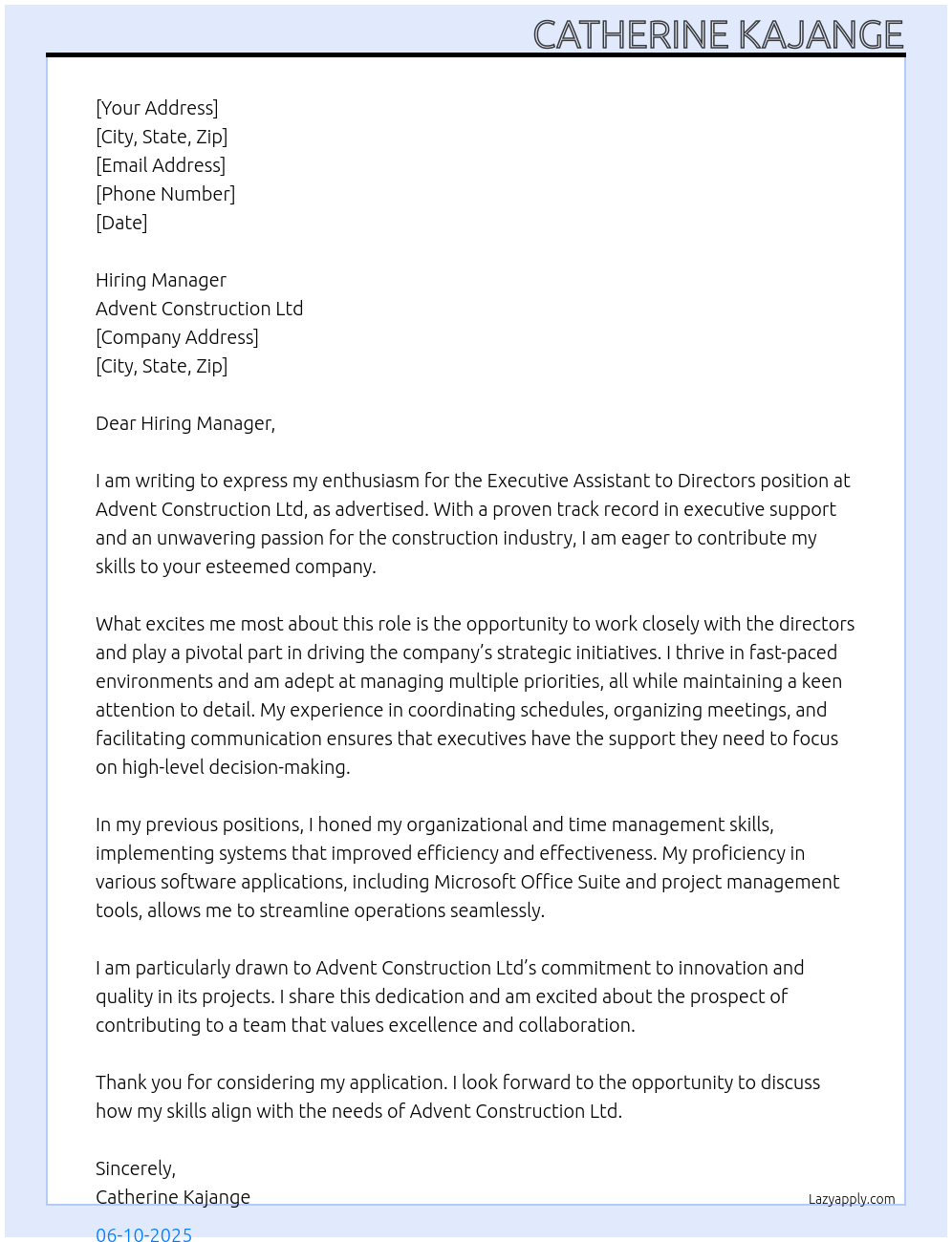 Executive Assisrant to directors Cover Letter At Advent Construction Ltd