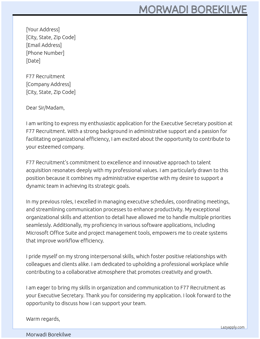 Executive Secretary  At F77 Recruitment  Cover Letter