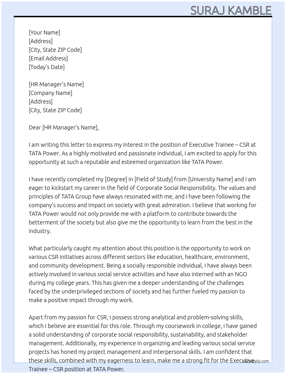 Check out these executive trainee – csr cover letter sample and examples previously used by job seekers to land on job interviews as executive trainee – csr. Use our AI cover letter generator to create a personalized cover letter as executive trainee – csr.