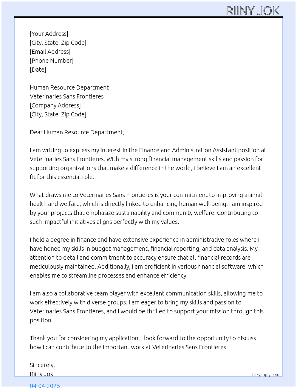 Finance and adminstration Assistant Cover Letter At Veterinaries Sans frontieres