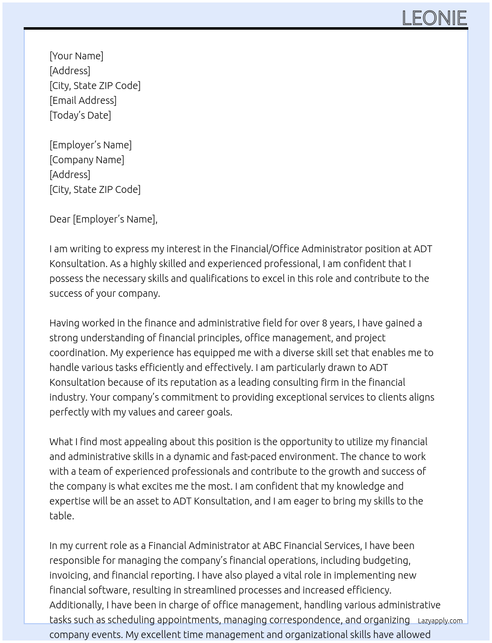 FINANCIAL/OFFICE ADMINISTRATOR Cover Letter At ADT KONSULTATION