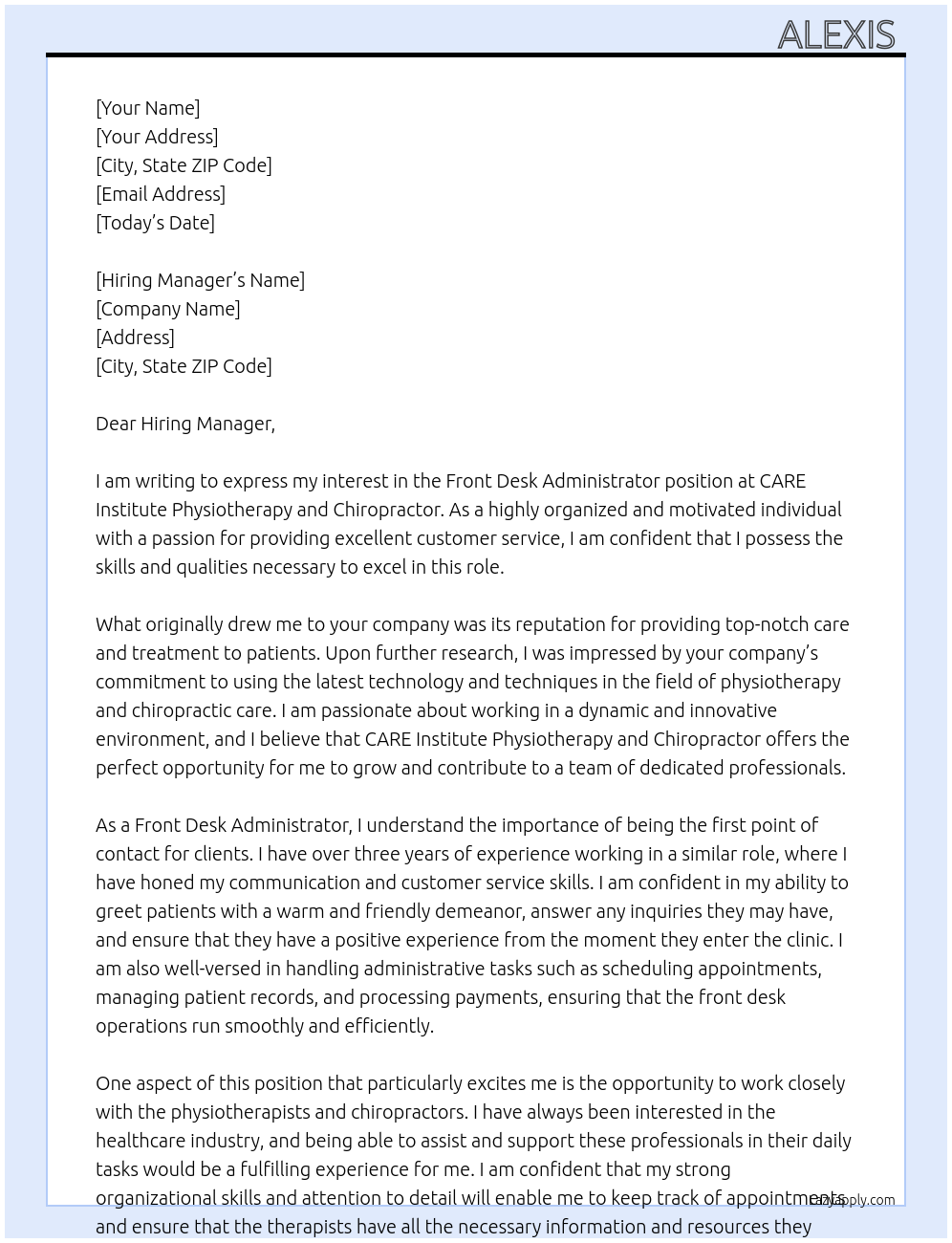 Front Desk Administrator Cover Letter At CARE institute Physiotherapy and Chiropractor